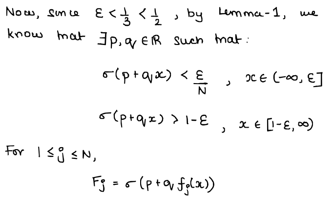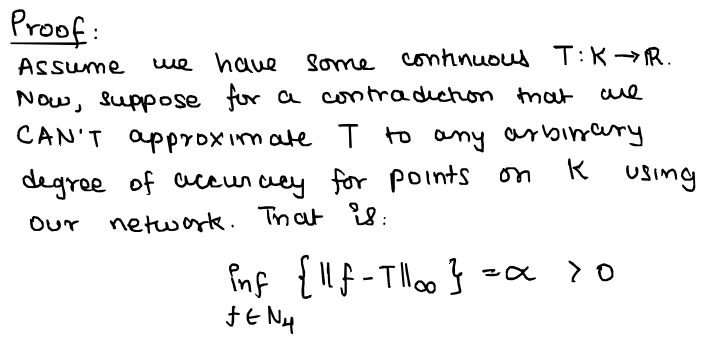 Now for the main event. The proof to our statement of the universal approximation theorem. A disclaimer: The author in the original paper referred to a function $f \in N_{4}$ to mean the output of a 3-hidden layer neural network itself, not a function in some 4th layer or something!