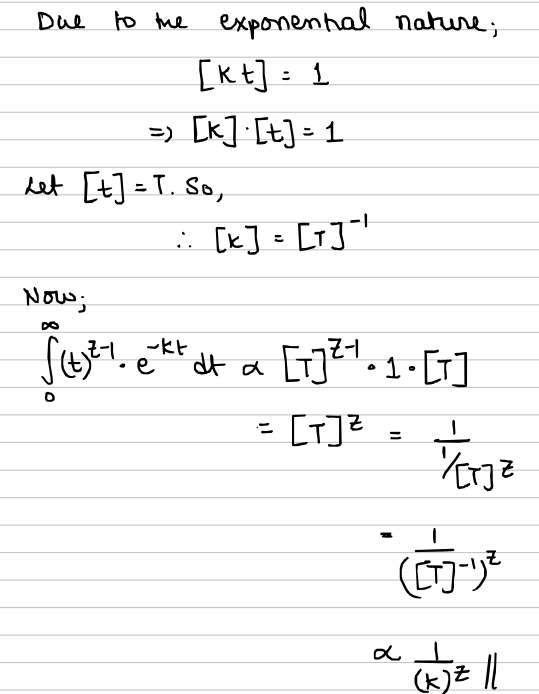 So now, we know that the integral will be equal to a quantity whose dimension is just $[T]$. Now, what known/persistent quantity do we know that has a dimension of $[T]$? That's right! It's our constant term, $\alpha$. This is what I meant earlier by choosing a set of dimensions that will preserve 'dimensional validity' of the integral.
